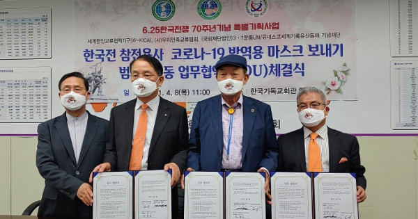 이와 관련하여 세계한인교류협력기구(공동회장 김희선 장로), 사)우리민족교류협회(이사장 송기학 장로), 국회재단법인)3.1운동 UN/유네스코등재기념재단(이사장 김영진 장로)은 8일 세기총 회의실에서 6.25 한국전쟁 70주년 특별기획사업 일환으로 평화 마스크 보내기 범국민운동 업무협약을 체결하고 본격적인 활동에 돌입했다.