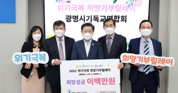 광명시기독교연합회(회장 한남기)는 12일 희망성금 200만원을 광명시사회복지협의회(회장 이상재)-광명희망나기운동본부에 전달하였다.