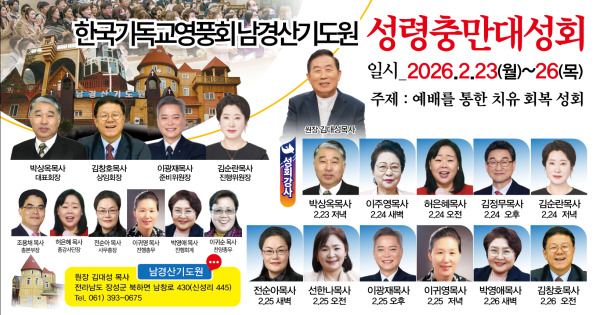 한국기독교영풍회가 주최하는 성령충만대성회가 오는 2월 23일부터 26일까지 전라남도 장성군 북하면에 위치한 남경산기도원(원장 김대성 목사)에서 열린다. 이번 성회는 ‘예배를 통한 치유와 회복’을 주제로 전국 각지에서 모인 목회자와 성도들이 함께 말씀과 기도에 집중하는 영성 집회로 마련됐다.