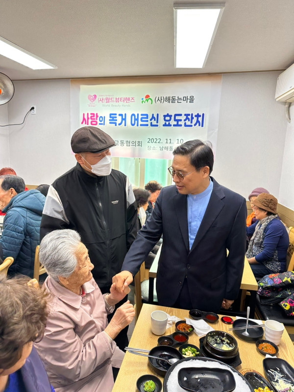 쪽방촌과 독거어르신을 섬기는 구호개발NGO (사)월드뷰티핸즈(회장 최에스더 신한대 뷰티헬스사이언스과 교수)가 주최하고 대흥동교동 종교협의회(회장 장헌일, 신생명나무교회)와 해돋는마을이 협력한 쪽방촌과 독거어르신 초청 사랑의 독거 어르신 효도잔치가 10일 남해돌수산에서 열렸다.
