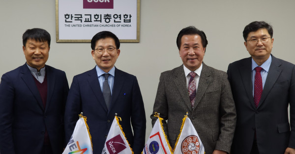 한국교회총연합(이하, 한교총)이 18일 오후 3시 사무실에서 세 곳의 전문 단체와 업무협력을 위한 협약식을 가졌다. 이번에 한교총이 MOU를 체결한 단체는 사단법인 한국기독교군선교연합회(이하 군선교연합회), 사단법인 새희망교화센터(이하 새희망센터), 사단법인 한국기독교문화유산보존협회(이하 한기문)로 교계에서 선교 역량을 발휘하고 있는 전문 사역단체다.