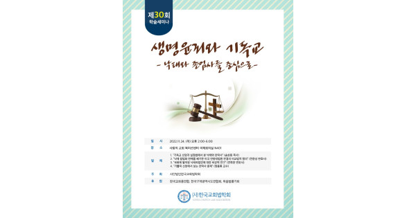 한국교회법학회(이사장 소강석 목사, 학회장 서헌제 교수)는 오는 24일 오후 2시 서울 사랑의교회 4층 국제회의실에서 “낙태와 존엄사를 중심으로 한 생명윤리와 기독교”라는 주제로 제30회 학술세미나를 개최한다.