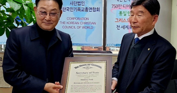 송지성 목사가 전달한 명예시민증서를 통해 브래드 래팬스퍼거(Brad Raffensperger) 조지아주 국무장관은 “신화석 목사와 신광수 목사가 그동안 보여준 여러 가지 헌신에 감사한다”면서 조지아주 ‘친선대사’로 임명하며 명예시민증서를 수여한다고 전했다.