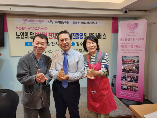 특별히 노인의 달을 기념하여 월드뷰티핸즈와 K-뷰티소사이어티연구소, 한국공공정책개발연구원의 고독생프로젝트 공공정책 실천을 위해 헤어와 메이크업 피부분야 프로전문가들과 오랫동안 자원봉사로 섬기고 있는 김광용 사진작가(빛과 예술로 대표)와 함께, 장수사진 촬영과 뷰티서비스를 통해 우울증해소와 공동체성 회복을 통한 기쁨과 감사의 시간을 가졌다.