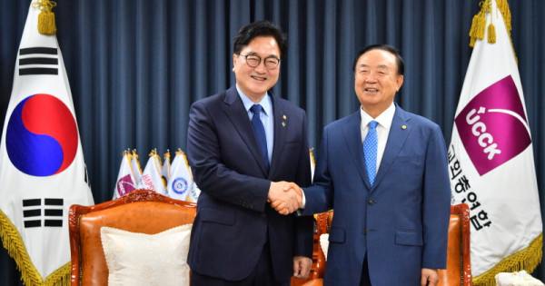 제22대 우원식 국회의장이 18일 (사)한국교회총연합(이하 한교총) 대표회장을 예방해 갈등 해소와 지혜로운 국회 운영을 위해 조언과 기도를 요청했다.