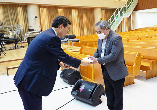 3일 오전 10시 오병이어교회서 열린 전달식에서는 코로나가 장기화되면서 사회적 거리두기로 대면 예배를 드릴 수 없어 성도 수가 감소하거나 재정적으로 힘든었던 목회자들을 초청해 위로하고 격려하는 시간을 가졌다.