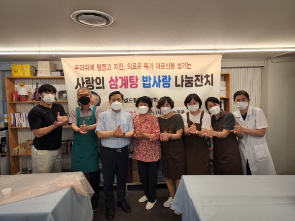 쪽방촌과 독거어르신을 섬기는 (사)해돋는마을(이사장 장헌일 신생명나무교회 목사)는 소셜서비스 전문인 봉사기관(사)월드뷰티핸즈(회장 최에스더 신한대 뷰티헬스학과 교수)과 함께 27일 엘드림노인대학 강당에서 독거어르신 삼계탕 나눔잔치를 갖고 쪽방촌과 독거 어르신, 거동이 불가능한 어르신께 사랑의 전복삼계탕과 시원한 수박과 참외 등 과일잔치로 섬겼다.