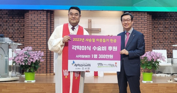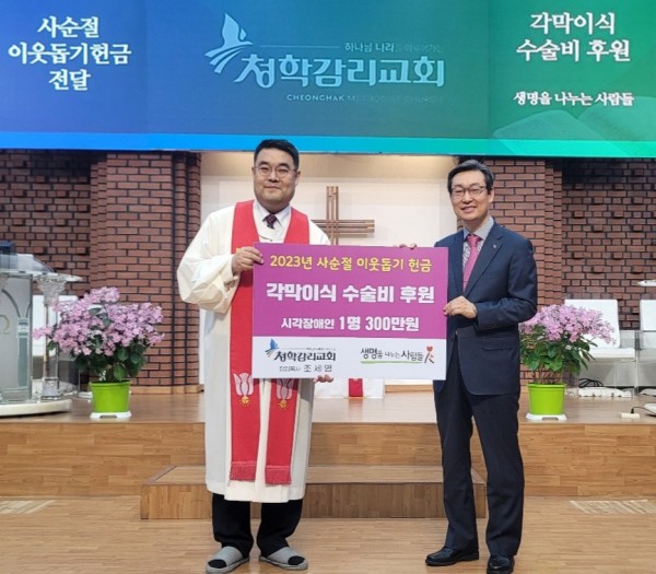 기독교대한감리회 총회 인준기관이며, 보건복지부 장기이식등록기관 (사)생명을나누는사람들(이사장 임석구 목사/상임대표 조정진 목사)은 28일 인천 청학교회(조세영 목사) 주일오전 11시예배에서 시각장애인에게 빛을 선물하는 ‘각막이식 수술비 후원’ 전달식을 가졌다고 밝혔다.