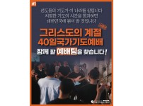 대한민국이 국가적 위기에 서울기독청년연합회가 1월 20일부터 2월 28일까지 매일 저녁 8시30분 서울시 관악구 더워십하우스에서 ‘그리스도의계절 40일국가기도예배’를 드린고 있다.‘그리스도의계절’은 청년들로부터 시작한 금식기도 운동으로 시즌 8까지 진행되어 왔다. 이번...