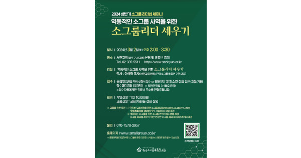 3월 2일 오후 2시에 열리는 이번 세미나는 한국소그룹목회연구원 홈페이지(www.smallgroup.co.kr)를 통해 개인도 신청할 수 있으며 신청한 교회와 참가자에게는 세미나를 위한 <강의안>과 격월간 큐티지 <찐큐티>를 제공 받을 수 있다. 또 단체(교회, 기관) 신청자에게는 <건강한 교회성장을 위한 소그룹 리더십(개정증보판, 2022)>의 내용을 근간으로 한 PPT강의안file을 담임목회자들께 제공하여 교회 내에서 소그룹리더들을 훈련할 수 있도록 도움을 줄 예정이고, 개학하는 소그룹 모임을 위한 “소그룹 언약서”file과 역동적인 소그룹 사역을 위한 “건강한 소그룹 리더 체크리스트”file을 전달할 예정이다. 세미나는 1인에 10,000원이며 교회단위의 신청자는 한국소그룹목회연구원(070-7578-2957)으로 연락을 하면 안내 받을 수 있다.