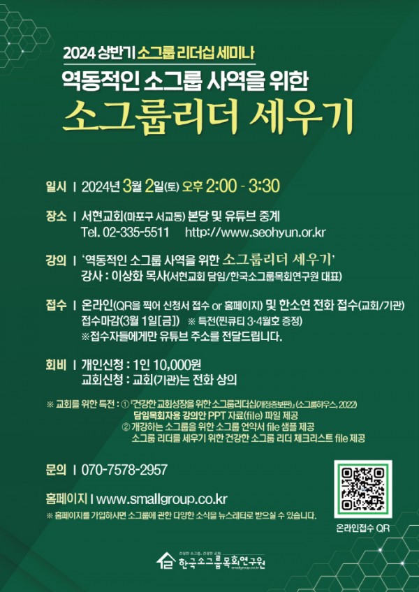‘건강한 소그룹, 건강한 교회!’를 목적으로 1994년부터 소그룹 양육체계와 자료를 개발하고 리더를 훈련시키는 소그룹 전문사역기관인 한국소그룹목회연구원(대표 이상화 목사/서현교회 담임)이 3월 2일 오후 2시 서울 서교동 서현교회에서 ‘역동적인 소그룹사역을 위한 소그룹리더 세우기’란 주제로 2024 상반기 소그룹리더십 세미나를 개최한다. 세미나는 현장 강의와 온라인 강의를 병행하여 진행할 예정이다.