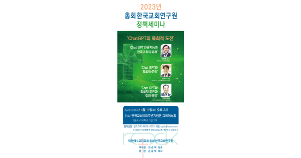 이번 정책 세미나는 ‘2023년 총회한국교회연구원 정책세미나, 오는 411일 오후 2, 장소는 한국교회100주년기념관 1층 그레이스홀에서 열린다. 세미나 주제는 ‘ChatGPT의 목회적 도전으로, 참여자들은 ChatGPT에 대한 이해를 확장하고, 목회적 응용 사례를 소개하며, 한국교회의 미래를 준비하는 시간을 가질 계획이다.