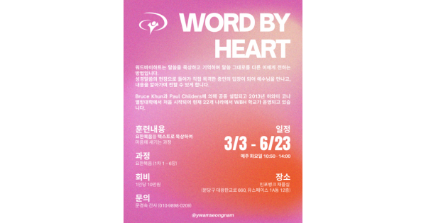 예수전도단 성남지부에서 ‘WORD BY HEART’(이하 WBH) 과정을 이수할 학생을 모집한다.
