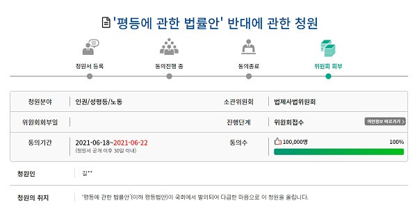 ‘평등에 관한 법률안’ 반대 국민동의 청원 10만 명 충족