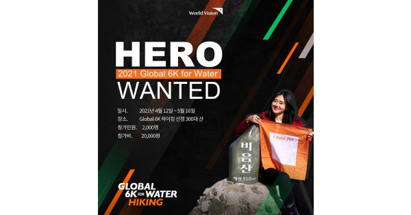 국제구호개발 NGO 월드비전(회장 조명환)이  ‘2021 글로벌 6K 포 워터(Global 6K for Water) 하이킹(이하 ‘글로벌 6K 하이킹’)’을 4월 12일부터 5월 16일까지 개최한다고 밝혔다. ‘글로벌 6K 하이킹’은 개발도상국 아동들이 겪는 식수 문제를 돕기 위해 산을 오르는 만큼 깨끗한 물을 기부하는 온택트 기반의 기부 캠페인이다.