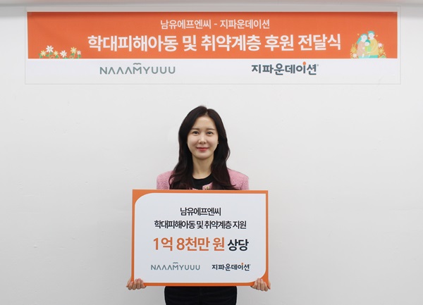 국제개발협력NGO 지파운데이션(대표 박충관)은 ㈜남유에프엔씨(대표 남유숙)가 학대 피해 아동 심리치료비와 취약계층을 위한 비타민을 지원하며, 총 1억 8천만 원 상당의 기부금품을 전달했다고 21일 밝혔다.