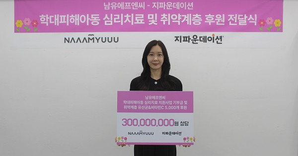 국제개발협력NGO 지파운데이션(대표 박충관)은 ㈜남유에프엔씨(대표 남유숙, 이하 남유네)가 학대 피해 아동의 정서 회복을 위한 심리치료비 1천만 원과 국내 취약계층 아동 ·청소년을 위한 2억 9천만 원 상당의 자사 영양제를 후원했다고 18일 밝혔다.