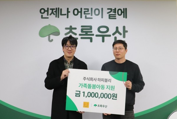 초록우산(대구지역본부장 문희영)은 하피블리(대표이사 이효민)로부터 대구지역 가족돌봄아동 지원을 위한 후원금 100만 원을 전달받았다고 밝혔다.