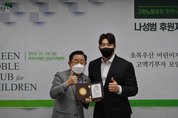 초록우산어린이재단 경남지역본부는 28일, 나성범 선수의 ‘그린노블클럽’ 가입 및 후원금 전달식을 진행했다.
