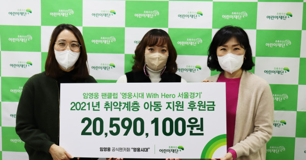 ‘영웅시대 With Hero(서울,경기)’ 관계자는 “가수 임영웅의 선한 마음처럼 팬클럽 회원들도 마음을 모아 선한 영향력을 펼치고 싶었다”면서 “지속되는 코로나19 상황 속에서 아이들의 삶이 조금이나마 나아지길 바란다”며 기부 소감을 밝혔다.