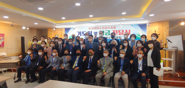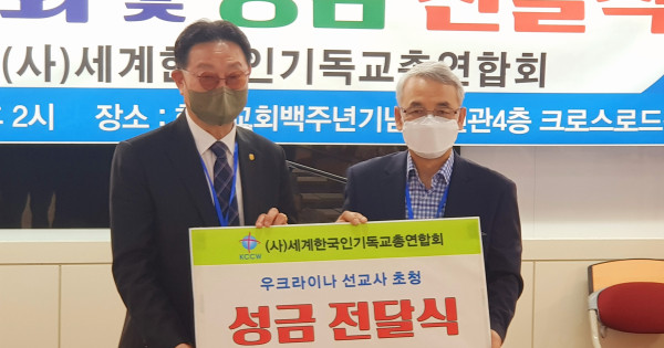 사단법인 세계한국인기독교총연합회(이하 세기총, 대표회장 신화석 목사, 사무총장 신광수 목사)는 6일 오후 2시 서울시 종로구에 위치한 한국교회백주년기념관 신관 4층 크로스로드선교회 세미나실에서 ‘우크라이나 선교사 초청 기도회 및 성금 전달식’을 갖고 전쟁으로 인해 고통 받고 있는 우크라이나 국민들을 위해 기도하는 한편, 우크라이나 선교사들의 선교활동을 후원하기 위한 성금 전달식을 진행했다.