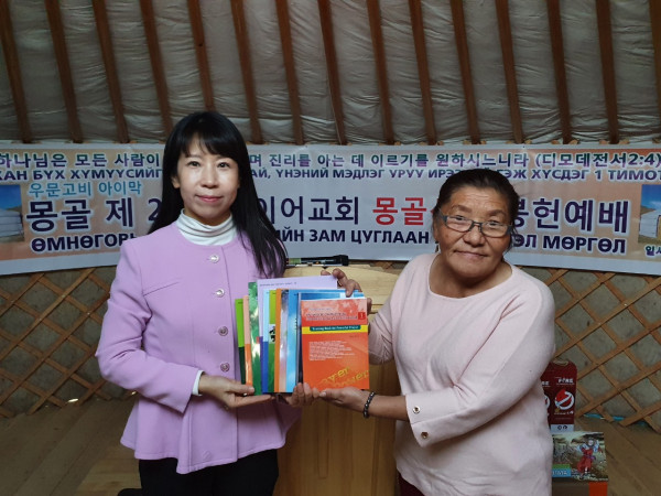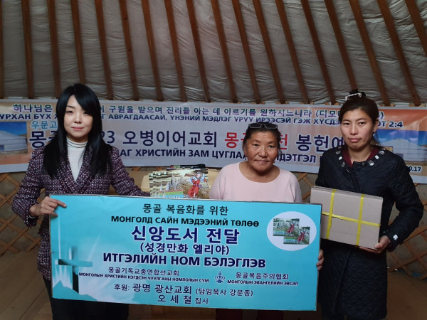 또한 지역 전도와 앙육을 위해 몽기총에서 현지어로 번역, 출판하여 몽골 현지 사역자를 대상으로 목회자 세미나를 하고 있는 ‘십자가의 길/저자:권영구 목사’ 목회, 양육교재 시리즈와 성경만화 엘리야(광명 광산교회 오세철 집사 후원)를 전달했다.