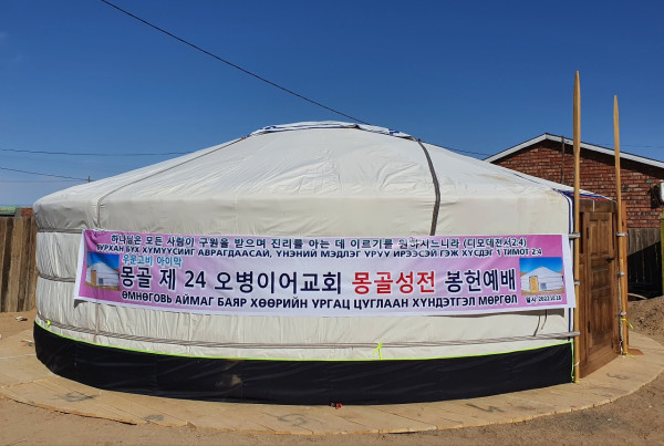 몽골과 중앙아시아를 넘어 세계복음화의 비전으로 오직 말씀에만 순종하며 활동하는 몽골기독교총연합선교회(법인회장 김동근 장로)의 사역에 동참하여 한국 광명오병이어교회(담임 권영구 목사)가 24번째 게르성전을 건축했다.