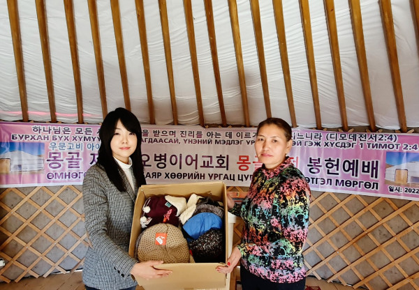 몽골 제 24오병이어교회(바야르 허링오르가츠교회)에는 게르 성전 뿐 아니라 몽기총에서 직접 제작한 강대상, 강단, 간판 등의 성물과 방한모자, 목도리, (주)DK글로벌 장은혜 대표가 후원한 소화기를 선물했다.