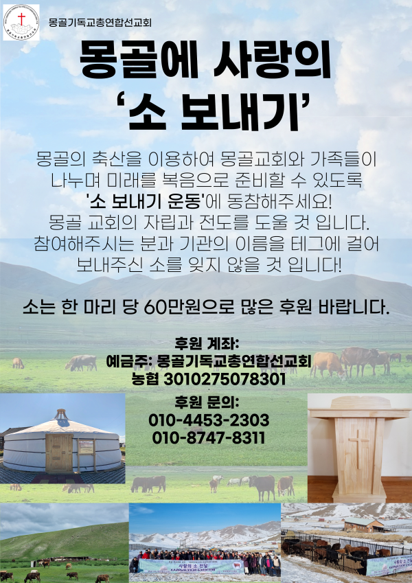 몽골 복음화를 위해 활발히 활동하고 있는 몽골현지 종교법인인 몽골기독교총연합선교회(법인회장 김동근 장로, 이하 몽기총)가 강대상 보급 운동과 게르성전 건축운동에 이어 몽골 복음화를 위한 ‘사랑의 소 보내기 운동’을 시작했다.