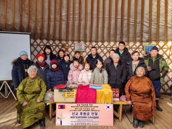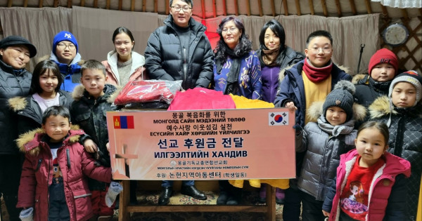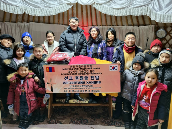 새해를 맞아 몽기총은 예수사랑 이웃섬김의 실천으로 울란바트르시 바양주르흐구 가쪼르트 마을에 가쪼르트 게렐교회 담당 사역자인 체체게 전도사에게 어린이 의류와 방한용품과 함께 후원금을 전달했다.