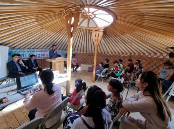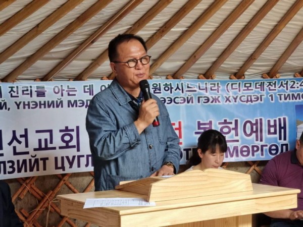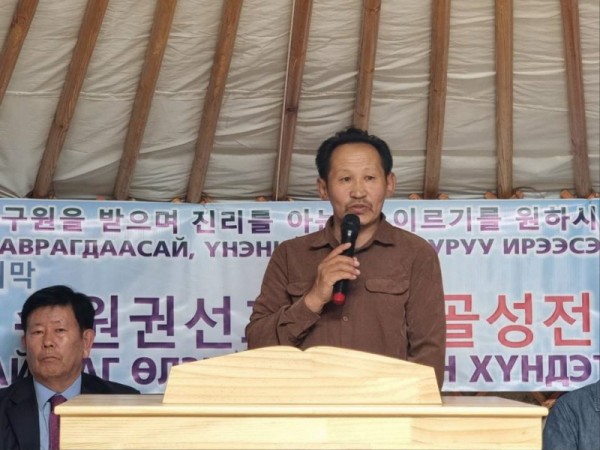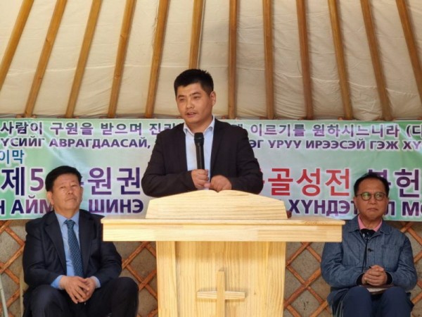 볼강 아이막 호딱 운드르솜 제 5수원권선제일교회(쉰잠교회) 서드벨렉 전도사는 “복음을 전할 수 있고, 모일 수 있는 장소가 생겨서 감사하다. 이 지역에 파송되어 온 가족이 함께 왔는데 멀리까지 와서 게르성전을 건축해 주신 은혜와 수고에 진심으로 감사드리며 주신 힘으로 열심히 사역하겠다”고 인사했다.