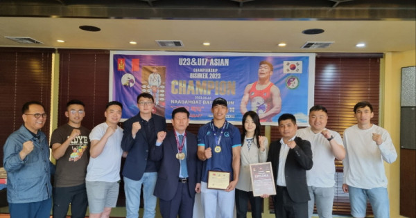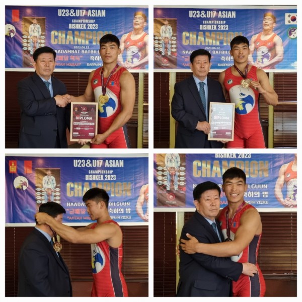몽골한국경제지원협의회(회장 김동근 장로)는 레슬링 바트빌궁선수에게 축하패를 전달하고 특별 상여금과 꽃다발을 전달했다.
