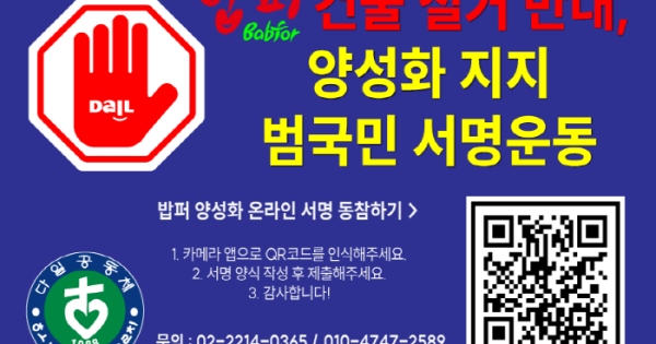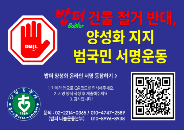 다일공동체는 밥퍼철거반대와 양성화지지 범국민 서명운동을 시작하며 밥퍼를 지키는 일은 이 땅의 사회적 약자들을 지키는 일만이 아니며, 무너져가는 대한민국의 공의와 가정과 교회를 사랑으로 살리는 일이고, 이 땅에 가난하고 소외된 이웃을 위해 아무런 대가와 보상 없이 나눔과 섬김의 사역을 36년 동안 이어온 ‘밥퍼’가 이렇게 부당한 공권력과 물질주의와 이기주의에 무너지는 것을 더 이상 방관할 수 없고 서명운동을 통해 온 국민에게 알리며 민주주의 국가에서 일어나서는 안 되는 일임을 선언하고자 함이다.