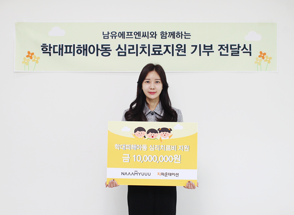 국제개발협력 NGO지파운데이션(대표 박충관)은 ㈜남유에프엔씨(대표 남유숙)이 학대피해 아동들의 심리치료 지원을 위해 후원금 1,000만 원을 기부 했다고 19일 밝혔다.