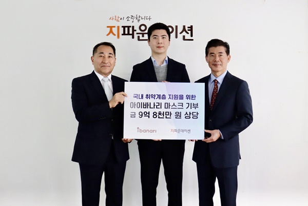 지파운데이션(대표 박충관)은 에스비글로벌헬스케어(회장 이상봉/대표 이승현)의 프리미엄 마스크 브랜드인 ‘아이바나리’가 경제적 어려움을 겪고 있는 취약계층을 위해 마스크 100만 장을 기부했다고 26일 밝혔다.