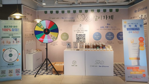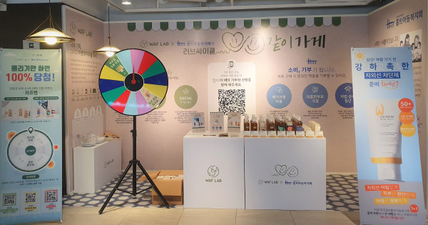 7월 초부터 김포공항 국내선 4층 SKY31에서 진행하고 있는 ‘같이가게’는 현장에서 와프랩 제품을 구입하면 동일한 제품을 국내 위기가정, 미혼한부모가정, 자립준비청년들에게 선물하는 착한소비 캠페인이다.