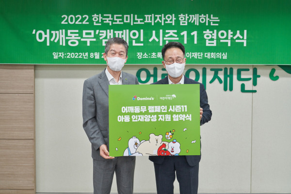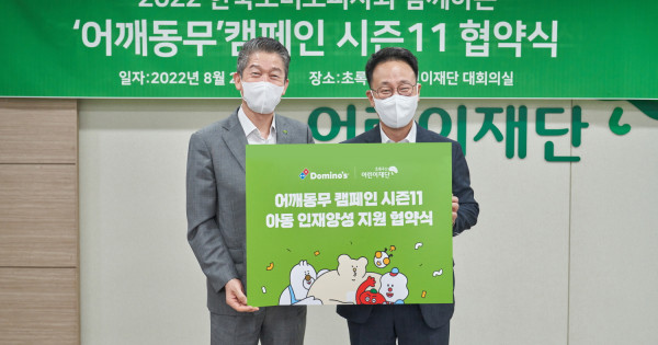 아동옹호대표기관 초록우산어린이재단(회장 황영기)은 한국도미노피자(회장 오광현)와 함께 23일 서울시 중구 초록우산어린이재단 본부에서 ‘어깨동무 캠페인 시즌 11’ 협약을 체결했다. 어깨동무 캠페인은 현실적인 어려움이 있는 아동들에게 도미노피자 희망나눔 캠페인의 판매 수익금으로 조성된 ‘희망나눔기금’과 도미노피자 임직원들의 후원금을 모아 전달하는 사회 공헌활동이다.