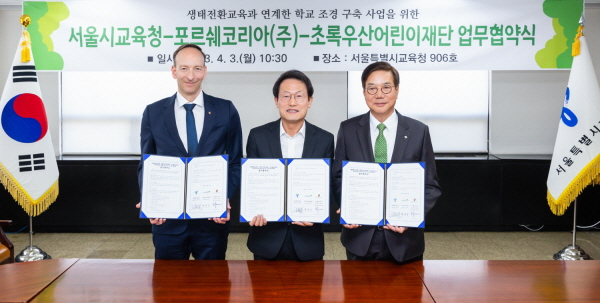 초록우산어린이재단(회장 황영기)은 3일 서울시 종로구 서울시교육청 본관에서 서울시교육청(교육감 조희연), 포르쉐코리아(대표 홀가 게어만)와 함께 학교의 녹지 보전과 확대를 위한 「생태전환교육과 연계한 학교조경구축 사업」 업무 협약을 체결했다.