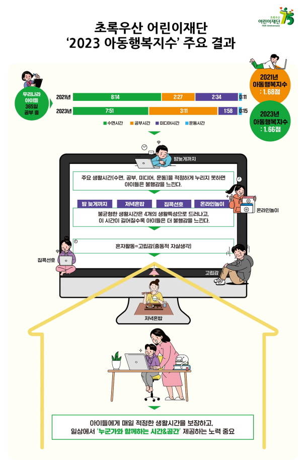초록우산어린이재단(회장 황영기)이 어린이날 101주년을 맞아 아동과 청소년의 일상 속 시간 균형을 분석한 ‘2023 아동행복지수 보고서’를 발표했다.