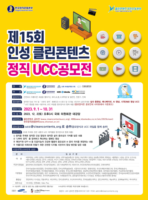 지난 20년간 꾸준히 우리 사회에 기독교 가치인 인성과 윤리를 확산하여 아름다운 세상을 만들기 위해 다양한 노력을 경주해온 클린콘텐츠국민본부(안종배 회장)는 2023년 9월 1일부터 한국정직운동본부(박경배 목사)와 공동 주최하고 국회 미래정책연구회, KBS미디어, 국제미래학회, 한국문화콘텐츠라이센싱협회와 공동으로 ‘제15회 인성 클린콘텐츠 정직 UCC 전국공모전’을 전국 최대 규모로 개최한다.  제15회에는 국회의장실 및 정부 부처 그리고 각 시도 교육청이 동참하고 삼성전자와 월트디즈니가 협찬하여 정직한 인성 가치 확산과 아름다운 세상을 위한 AI윤리 및 디지털 시민의식 향상을 위해 협력하고 있다.