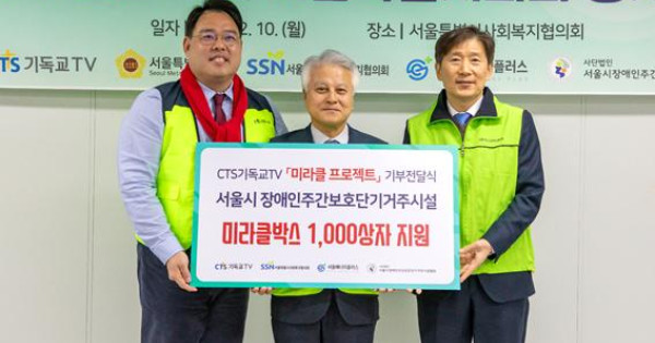 CTS기독교TV(이하 CTS, 회장 감경철)가 지난 10일 서울특별시사회복지협의회에서 서울시 취약 계층을 위한 「7000미라클 박스 기부 전달식」을 진행했다. 이날 기부전달식에는 CTS 최현탁 사장과 서울특별시의회 이성배 의원, 서울특별시사회복지협의회 김현훈 회장 등이 참석했다.