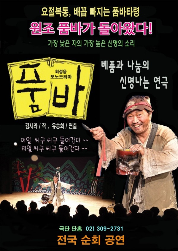 <품바>는 일제 압박의 식민지 시대부터 자유당 말기까지 전국을 떠돌며 살다간 한 각설이 패 대장의 일대기로 각설이 타령이 안고 있는 한과 해학을 밀도 있게 조명한 모노드라마이다.