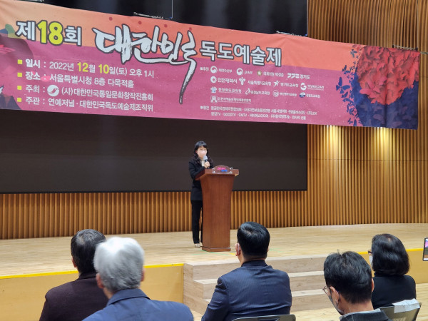 유미정 운영이사가 대독한 환영사에서 정재은 대회장은 “연례행사로 개최되는 대한민국 독도예술제가 올해로 18회를 맞이하게 됐다. 동해를 묵묵히 지키고 있는 우리 섬 독도, 일본과의 영토권 시비에 휘말려 있는 이 시대에 독도예술제 개최는 참으로 많은 의미와 시대에 전하는 메시지를 안고 있다”고 말했다. 이와 함께 “독도를 사랑하는 마음으로 많은 작품들을 출품한 학생 및 일반인들에게 감사를 표하면서 매년 높아져 가는 기량에 찬사를 보내며 그 기량과 독도에 대한 애틋한 마음들이 국토수호와 독도지킴으로 꽃 피워지기를 바란다”했다.