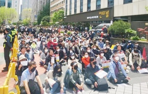 알바이오 네이처셀 주주들이 최근 서울 영등포구 여의도 국민의힘 당사 앞에서 식약처와 중앙약심위를 규탄하는 집회를 개최했다.