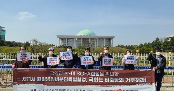 불평등한 한미 소파(SOFA·주둔군지위협정) 개정 국민연대(상임대표의장 이장희), 평화통일시민연대, 남북경협국민운동본부 등 40개 단체는 15일 오후2시, 서울 영등포구 여의도 국회 앞에서 제11차 한미방위비분담특별협정(SMA) 국회 비준동의 거부 기자회견을 개최했다고 밝혔다.