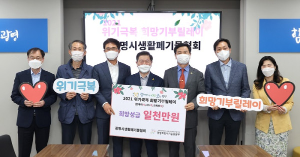 광명시생활폐기물협회(회장 박세용)은 지난달 30일 희망성금 1천만원을 광명시사회복지협의회(회장 이상재)-광명희망나기운동본부에 전달했다.