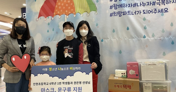 6학년1반 학생들과 권은영 선생님은 4일 희망성품 마스크, 문구류 선물박스를 광명시사회복지협의회(회장 이상재)-광명희망나기운동본부을 전달하였다.