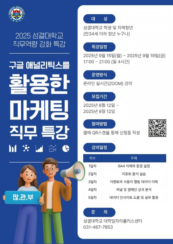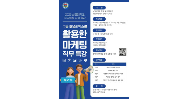 성결대학교(www.sungkyul.ac.kr, 총장: 정희석)대학일자리플러스센터가 오는 9월 15일부터 29일까지 2주간 온라인 실시간(Zoom) 방식으로 재학생·졸업생·지역 청년(만 34세 이하)을 대상으로 ‘구글 애널리틱스를 활용한 마케팅 직무특강’(9월 15~19일)과 ‘피그마를 활용한 UX/UI 디자인 직무특강’(9월 23~29일)을 각각 5일 과정으로 운영했다. 이번 특강은 AI와 데이터 분석, 디자인 실습을 결합한 직무 역량 강화 프로그램으로, 청년들의 실질적인 취업 준비와 현장 적용 능력 제고를 목표로 했다.