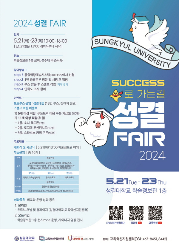 성결대학교(www.sungkyul.ac.kr, 총장: 김상식) 지난 21일부터 23일까지 성결대 학술정보관 1층 로비 및 야외 분수대 주변에서 성결대 교과·비교과 교육과정 홍보 및 성과공유, 지역사회 청년정책 안내를 통해 학생 참여 활성화를 도모하고자 재학생을 대상으로「SUCCESS로 가는 길, 성결 FAIR 2024」를 개최했다.