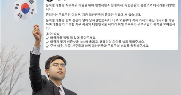 이 후보는 해당 게시물을 통해 “대통령 탄핵 심판이 얼마 남지 않았다”며, “바로 오늘부터 각자 가지고 계신 태극기를 게양하여 대통령의 조속한 직무 복귀와 대한민국을 지키기 위해 보수우파 구로구민의 저력을 보여주자”라고 제안했다.
